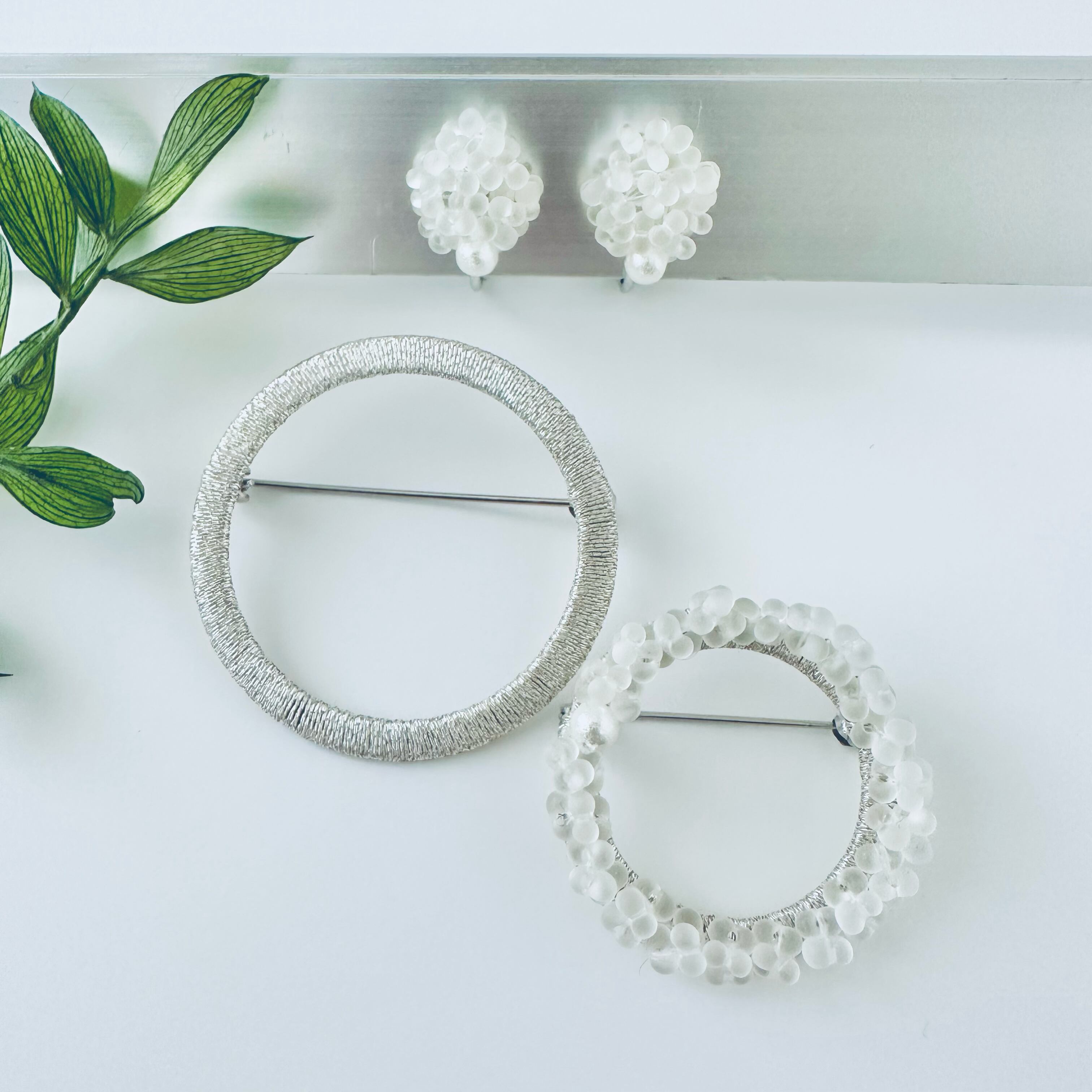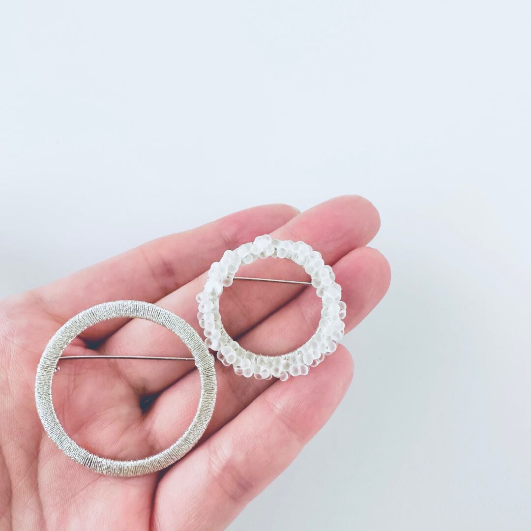 【creema特集掲載】つぶつぶガラスビーズ刺繍と一粒コットンパールシンプルフープブローチとイヤリング/ピアスセット【受注製作】#2+22