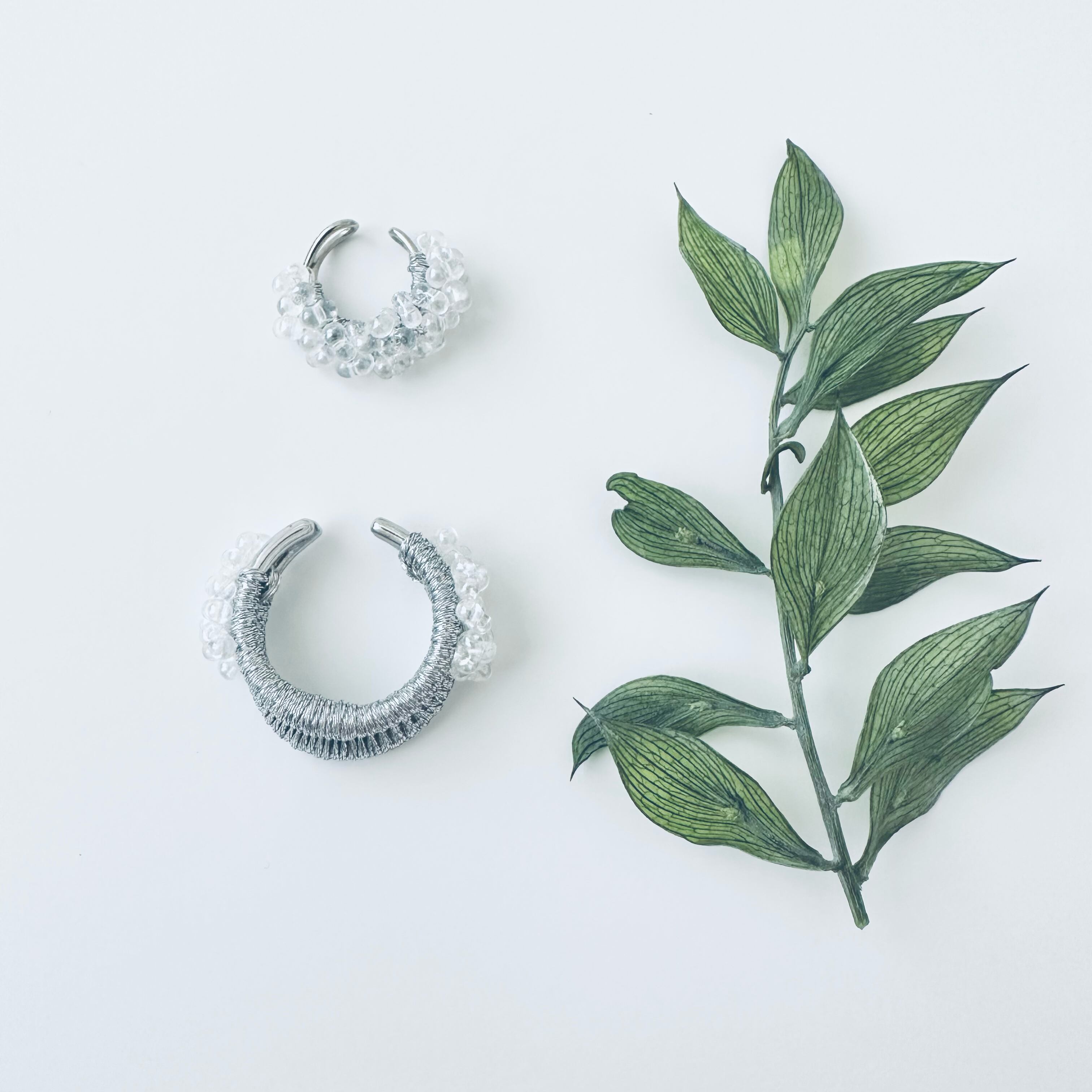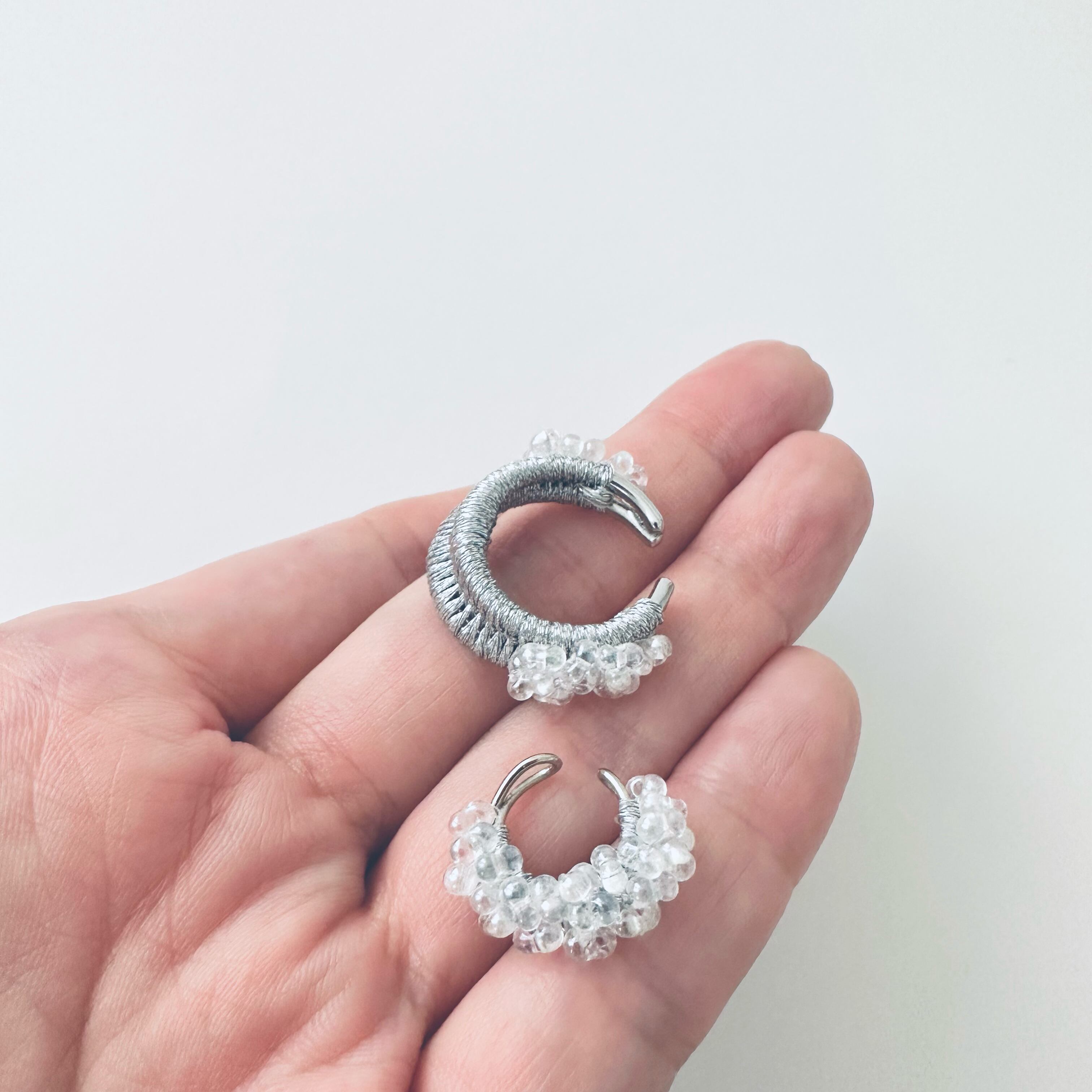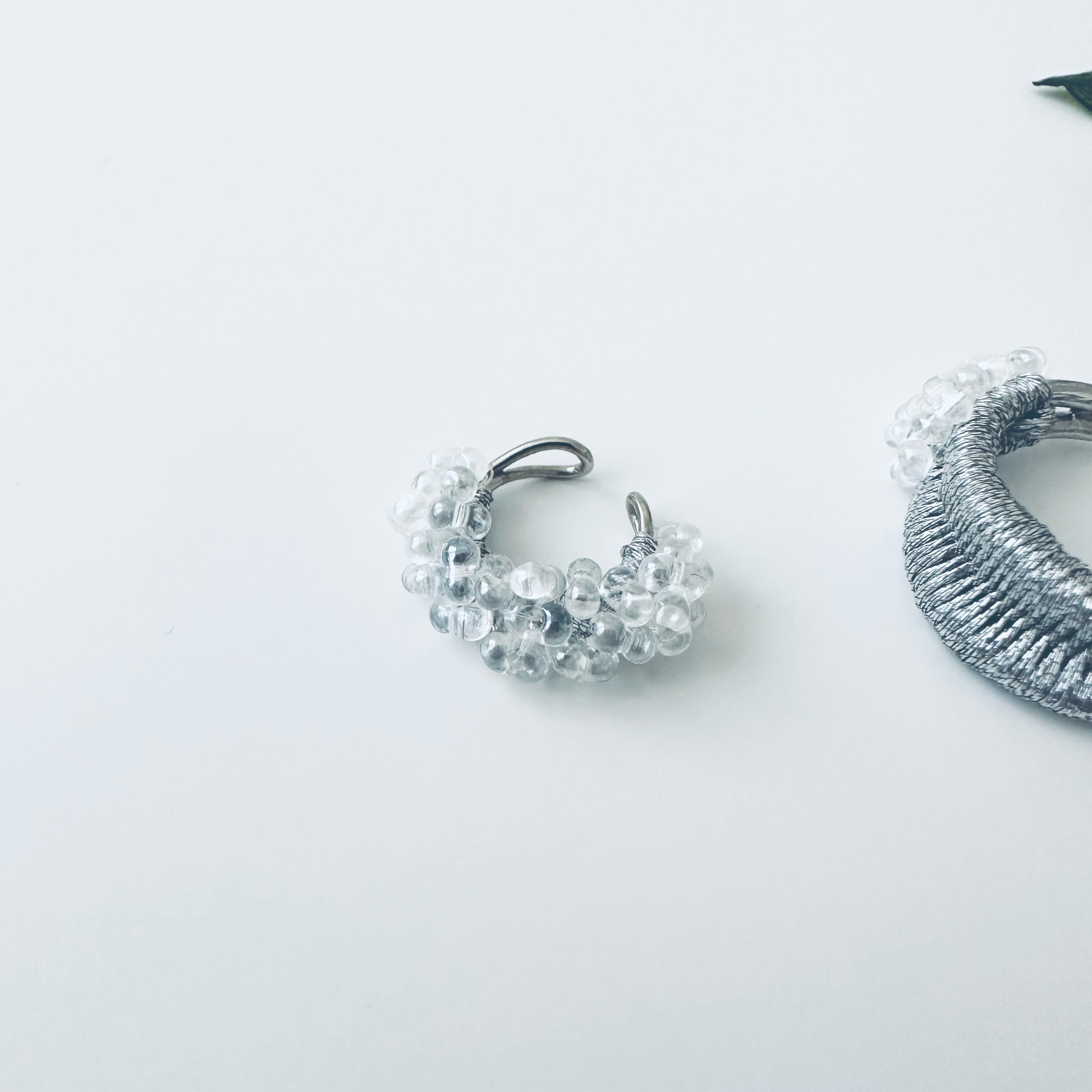 ガラスビーズ刺繍イヤーカフ2個セット — クリア×銀糸 上品ペア使い|ミニマルハンドメイド|くく couture #28