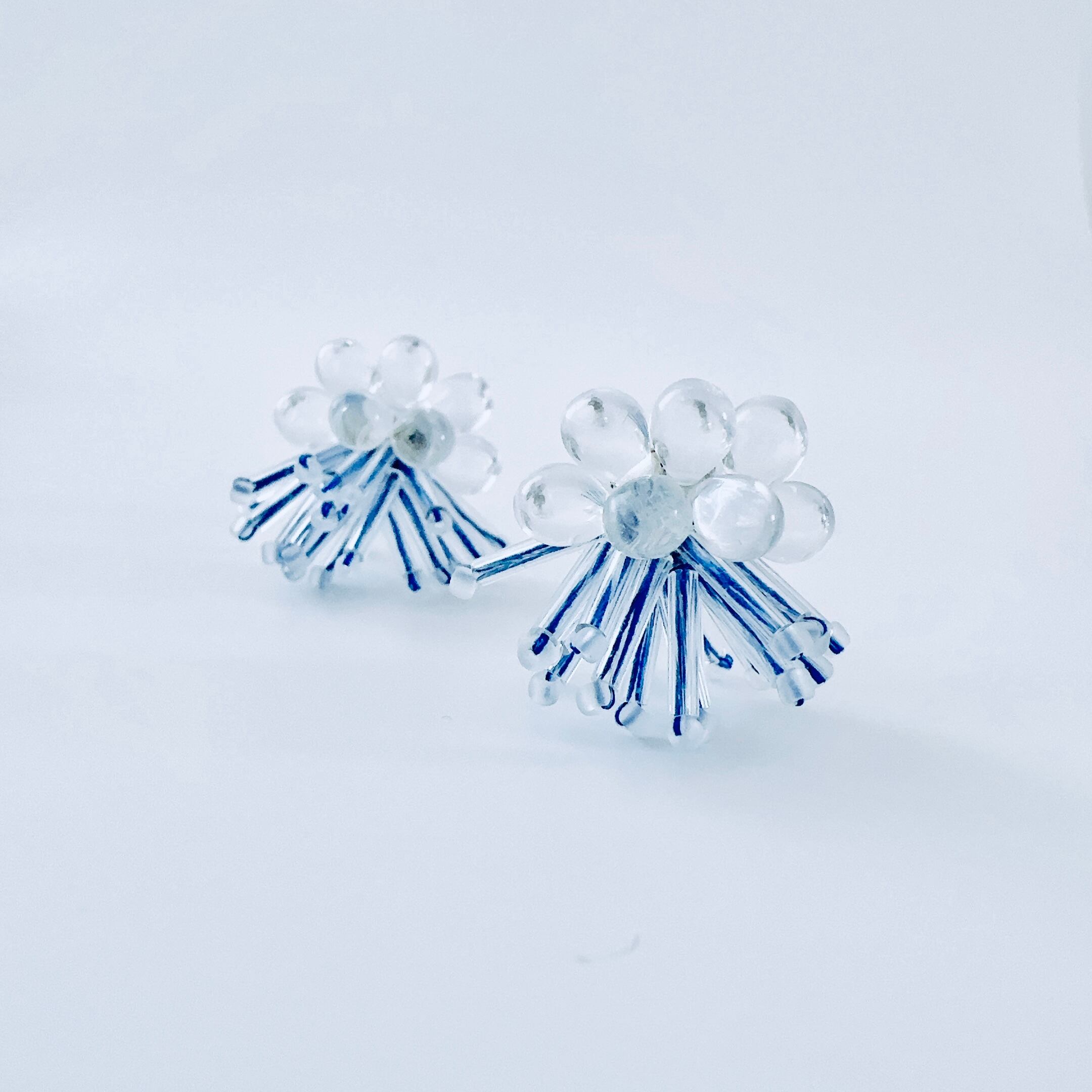 ・透明ガラスビーズと鮮やかな青い刺繍糸がアクセント