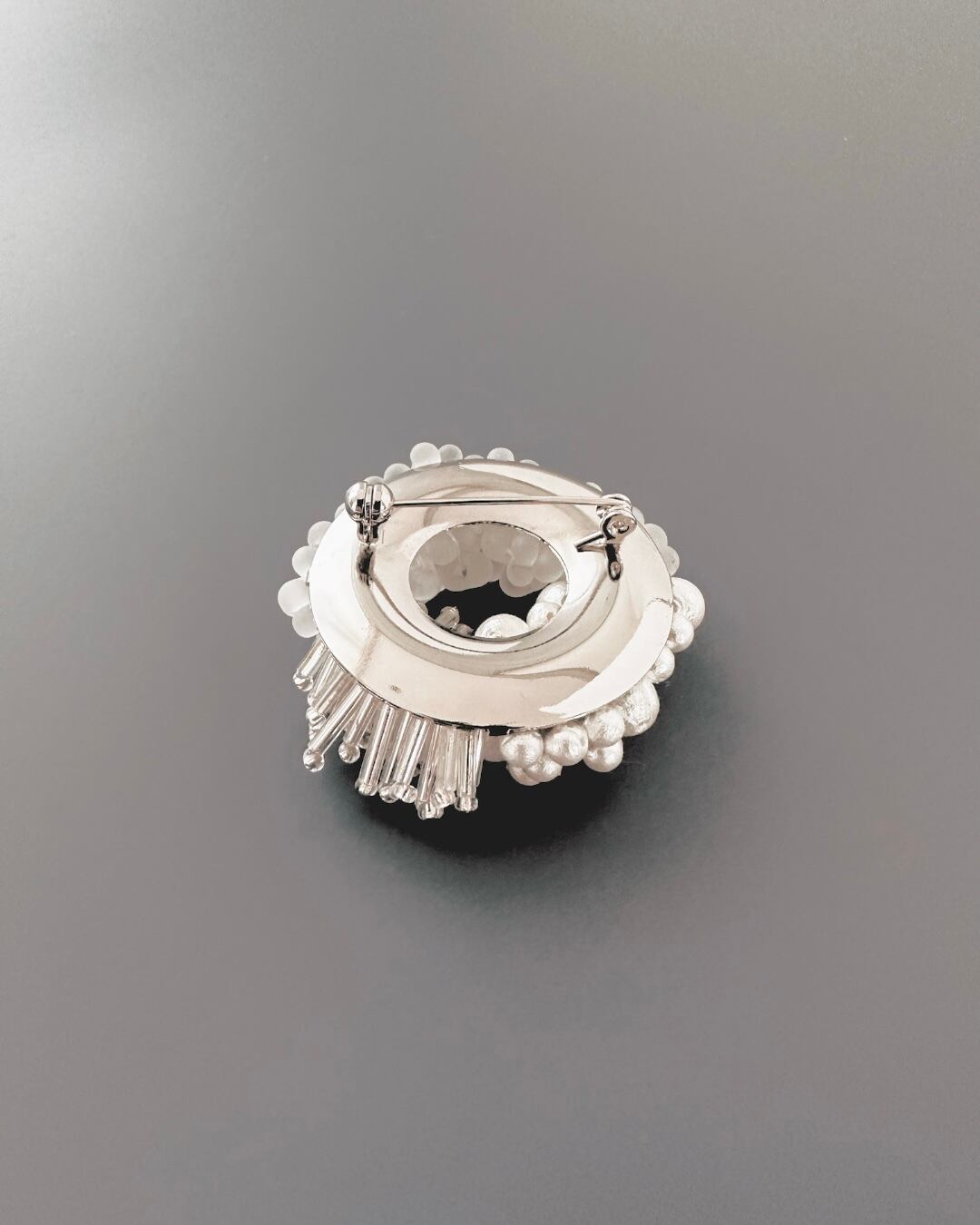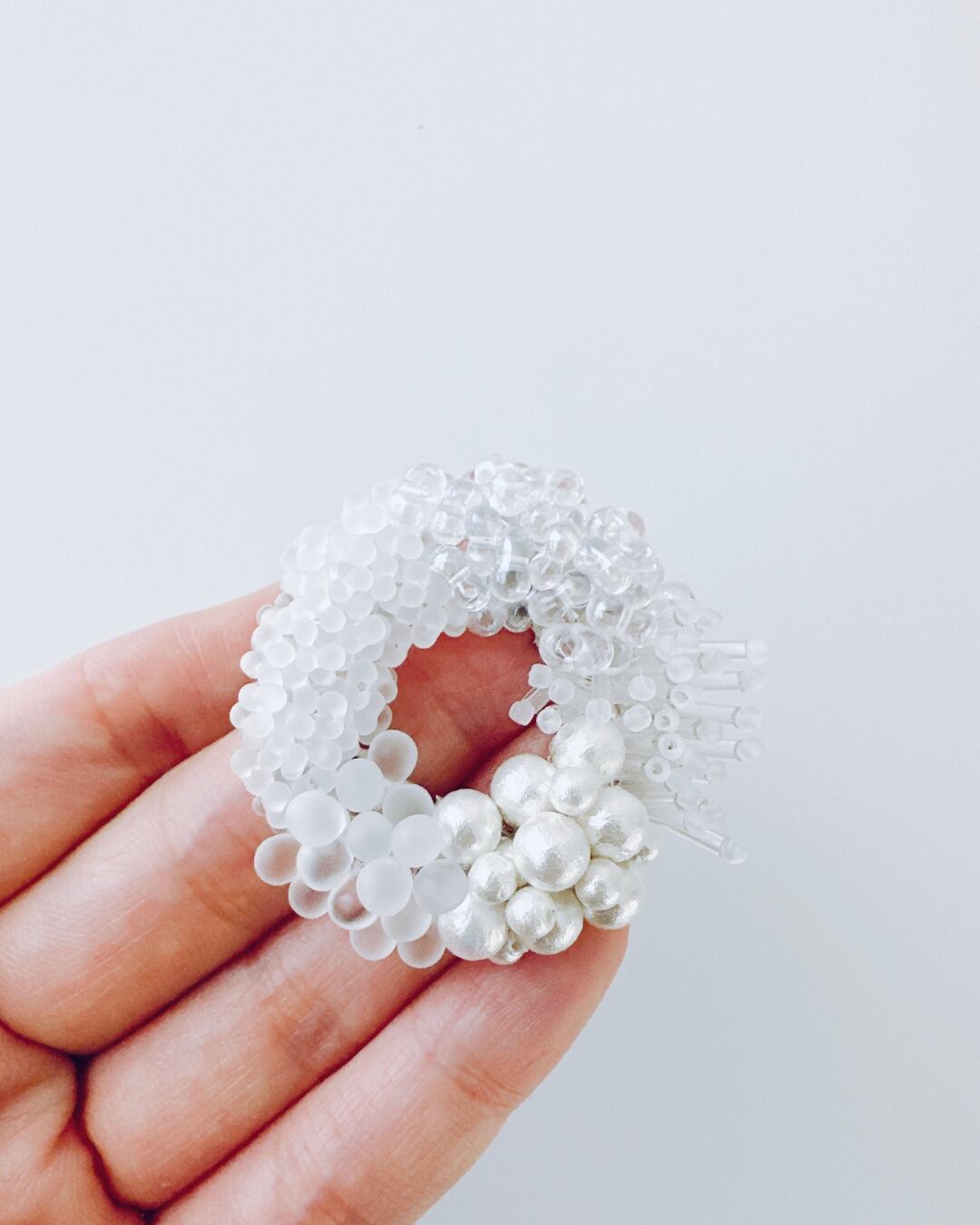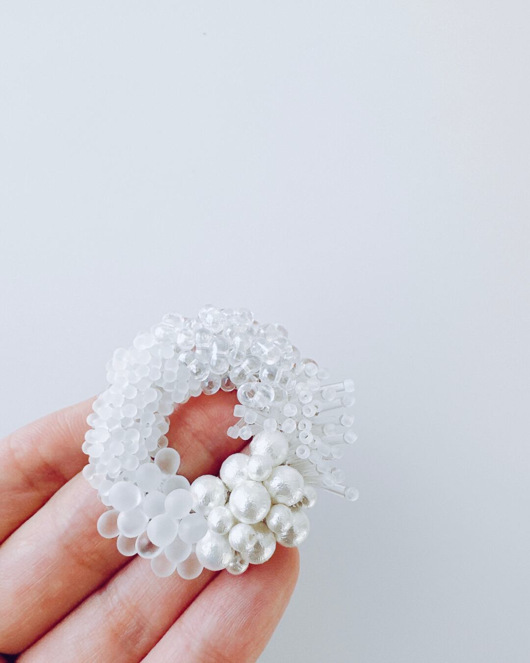 ガラスビーズ刺繍ブローチ 白いリース — コットンパールが連なるミニマルリース型|ミニマルハンドメイド|くく couture #55